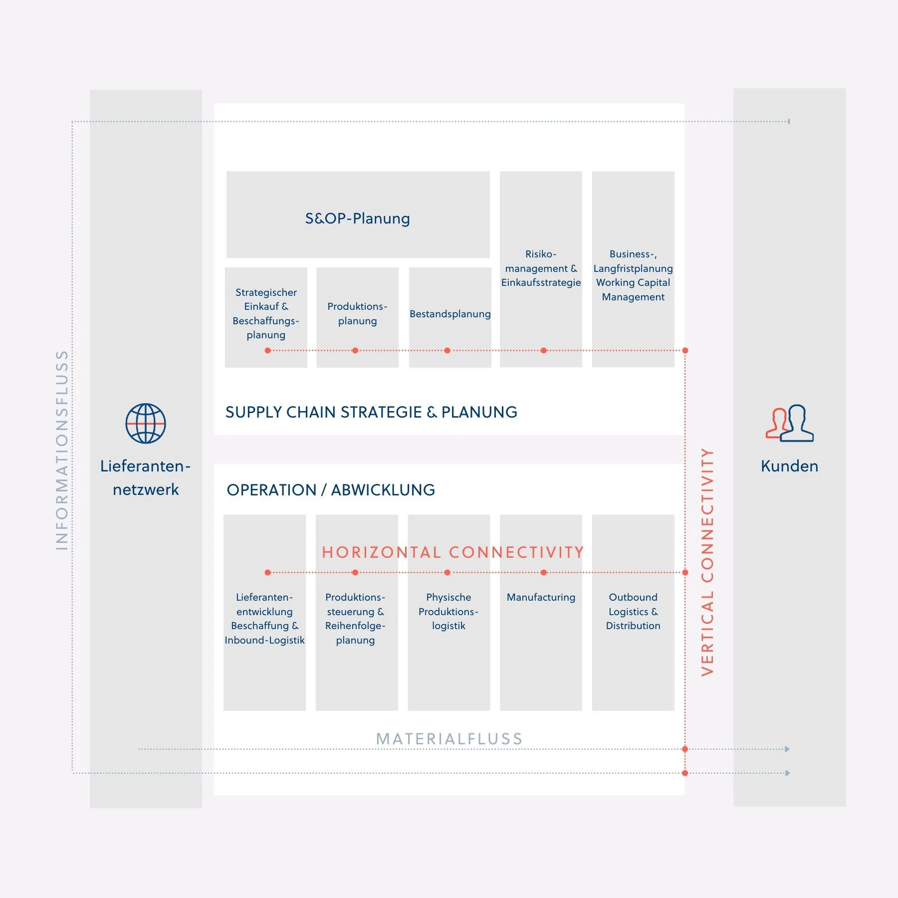 Gemeinsam mit Ihnen bauen wir Ihre Supply Chain zukunfts- und kundenorientiert so auf, dass diese anpassungsfähig und robust gegenüber Veränderungen wird. Dafür verstehen wir Ihre Supply Chain ganzheitlich und beziehen alle betroffenen Unternehmensprozesse mit ein. Unsere Herangehensweise ist dabei datenzentriert, agil und nutzt digitale Technologien wo immer dies sinnvoll ist.