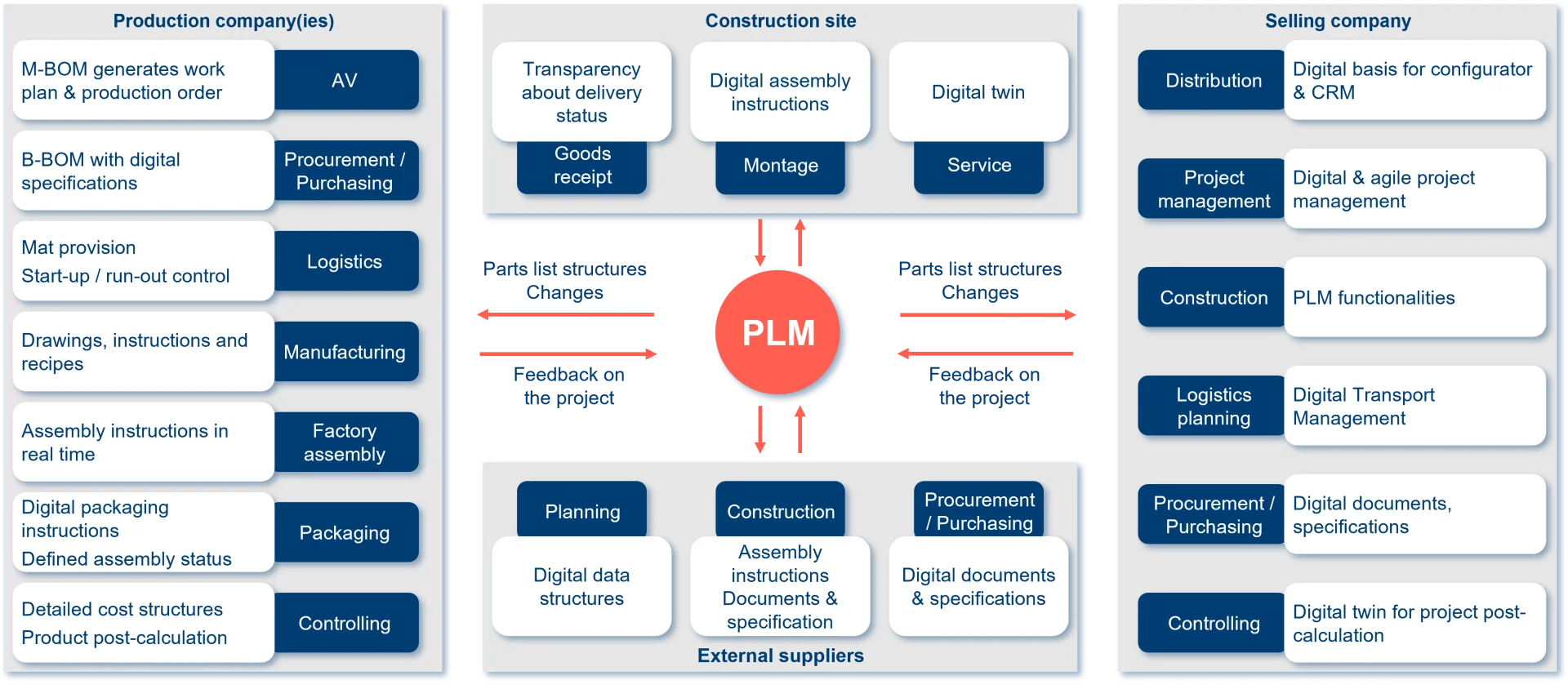 Modern PLM systems support companies in these diverse and challenging tasks. On the one hand, PLM systems manage a wide variety of product data (requirements, product structure, drawings), but also their relationship to each other and to other components such as software, standard parts catalogs, etc. The interfaces to authoring systems such as CAD systems and to the systems that use this data, such as sales configurators or after-sales service systems, are particularly important here.