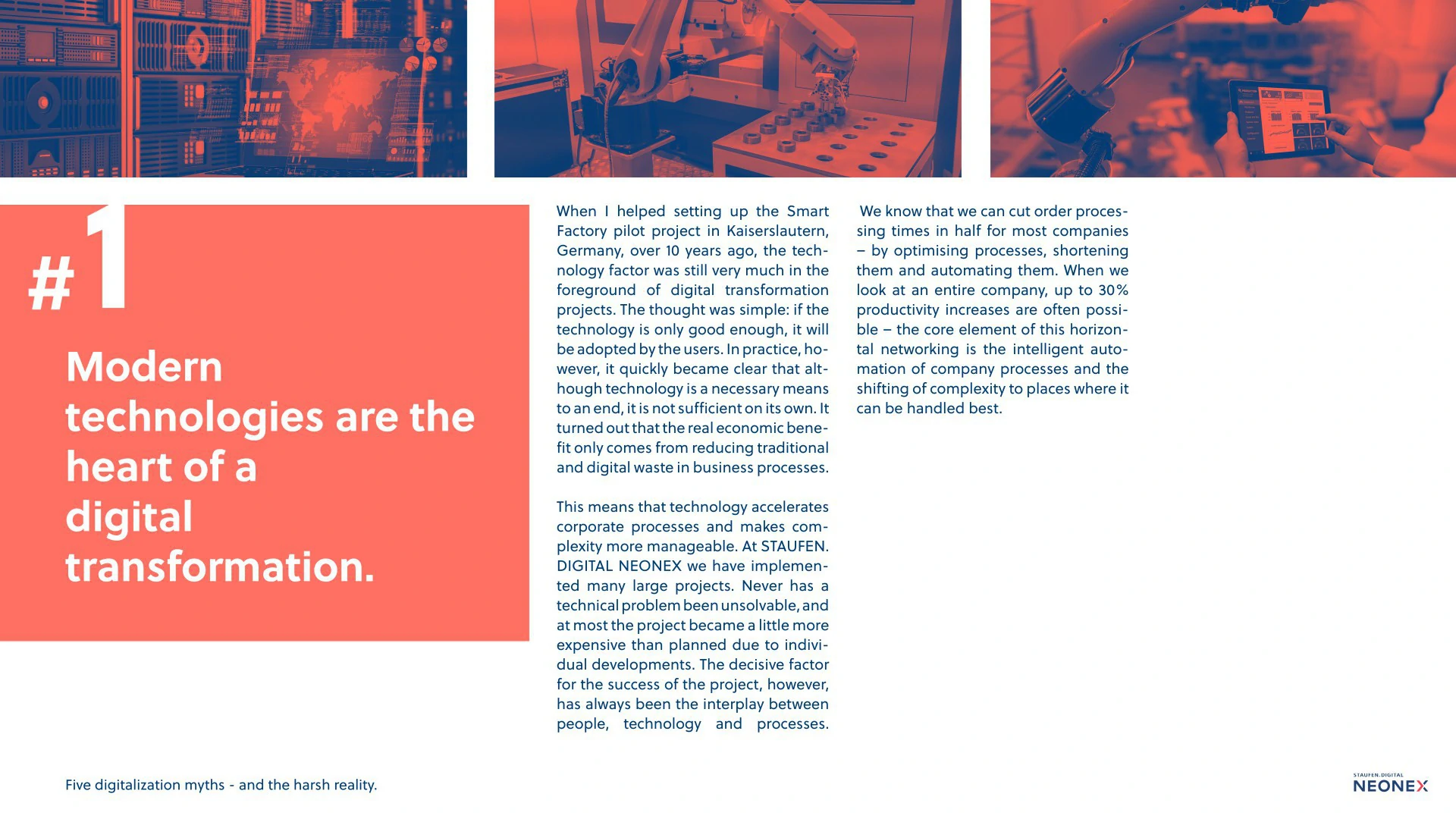 These are three of the five digitalization myths that Senior Partner Dr. Jochen Schlick has encountered again and again in five years of experience at NEONEX. But are they really true? In his paper, Dr. Schlick clears up these issues and often proves the opposite of the claimed myths.