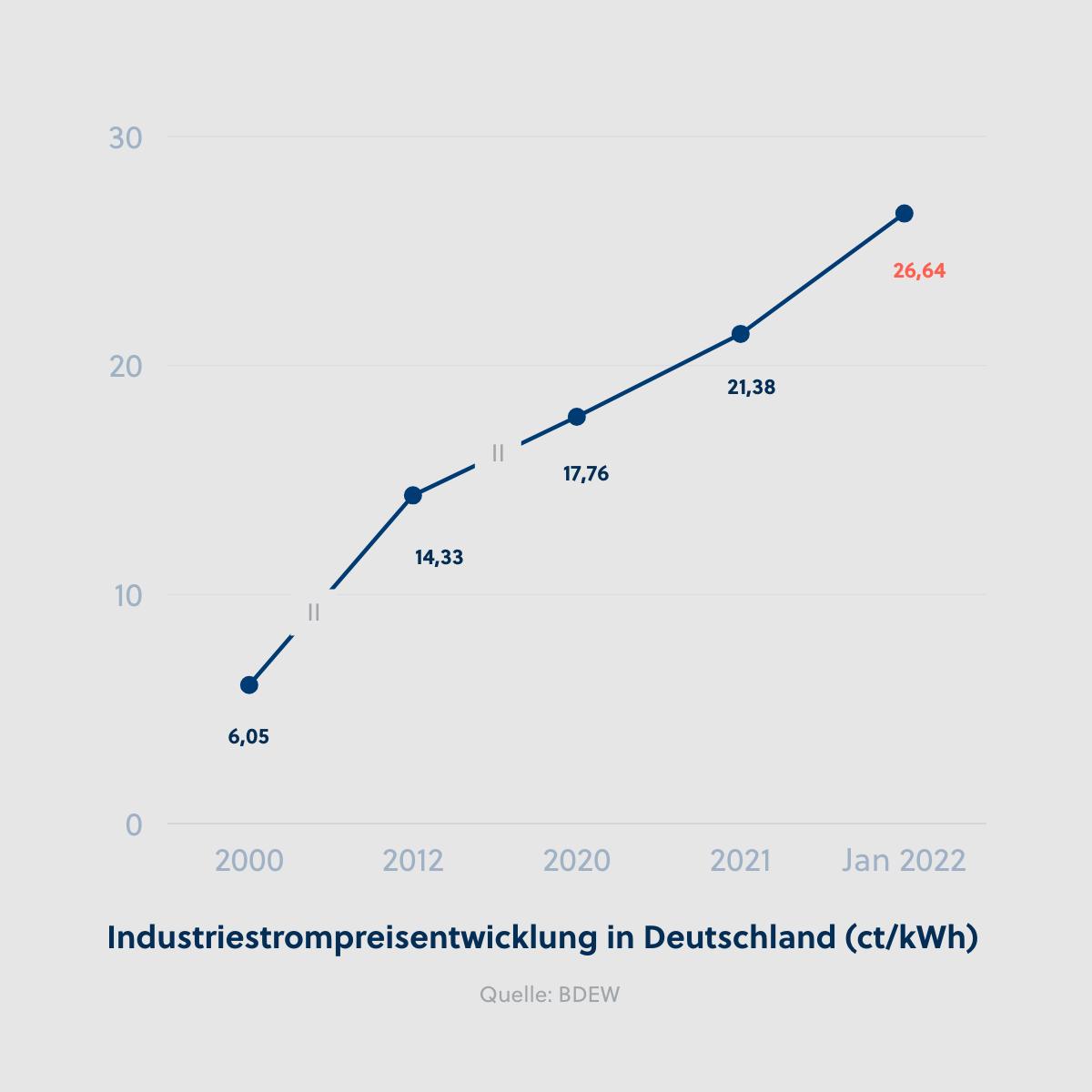 Erhöhte Nachfrage, langsamer Ausbau erneuerbarer Energien und die drohende Verknappung von Ressourcen: Zahlreiche Faktoren ließen den Strompreis in Deutschland zuletzt drastisch in die Höhe schnellen. Der Industriestrompreis pro Kilowattstunde stieg von 17,76 Cent im Jahr 2020, auf 21,38 Cent im Jahr 2021 und 26,64 Cent im Januar 2022 – eine Preiserhöhung, die selbst die Preisentwicklungen in der Ölkrise der 70er Jahre in den Schatten stellt. Der Krieg in der Ukraine verschärft die Situation weiter. Und obwohl die Politik durch die vorzeitige Abschaffung der EEG-Umlage Entlastung bringen möchte, wird dieser Wegfall allein den Trend steigender Strompreise wohl nur geringfügig abschwächen. Denn ein wesentlicher Treiber für die gestiegenen Strompreise sind Netzentgelte, die sich durch den teuren Netzausbau für erneuerbare Energien und E-Mobilität erhöht haben. Auch die geplante Steigerung des nationalen CO2-Preises wird sich in weiter steigenden Energiekosten niederschlagen.