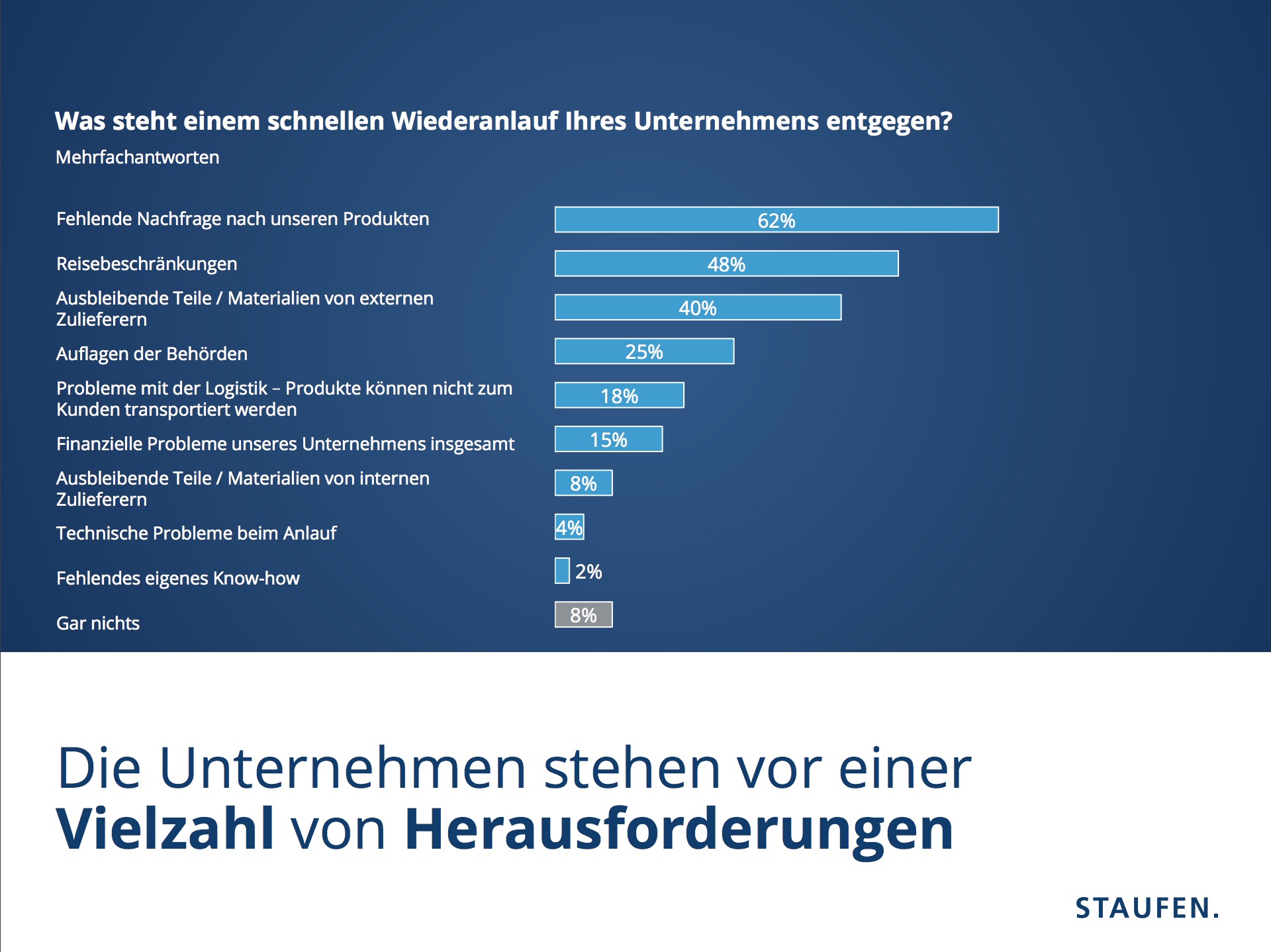 Köngen – Die weltweit eingeleiteten Maßnahmen zur Eindämmung der Covid-19-Pandemie entwickeln sich für die Industrie zu einer langanhaltenden Belastungsprobe. 56 Prozent der Unternehmen gehen davon aus, dass sie frühestens zum Jahreswechsel oder sogar erst im Laufe des kommenden Jahres wieder so arbeiten können wie vor dem Shutdown. Laut der aktuellen Studie „Neustart nach dem Shutdown 2020“ befürchten sieben Prozent der Firmen allerdings, bis dahin nicht mehr durchzuhalten. Für die Untersuchung hat die Unternehmensberatung Staufen im April mehr als 730 Unternehmen befragt. Die Teilnehmer kamen aus Deutschland, USA, China, Brasilien, Mexiko, Schweiz, Italien, Polen, Ungarn, Tschechien, Slowakei und Rumänien.
