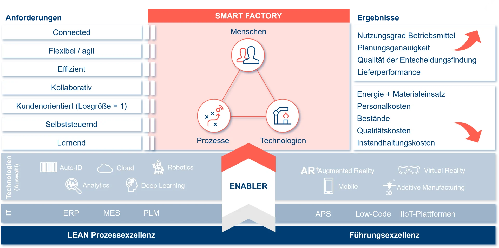 In order for the smart factory to realize its potential, it needs a solid foundation consisting of several elements: lean, stable processes based on lean management principles and methods are required. Another important foundation is leadership and management excellence, which enables both the transformation and the actual efficiency of a smart factory. Of course, the maturity levels of lean enterprise and leadership do not have to be perfect at the beginning - but a good basis is helpful.