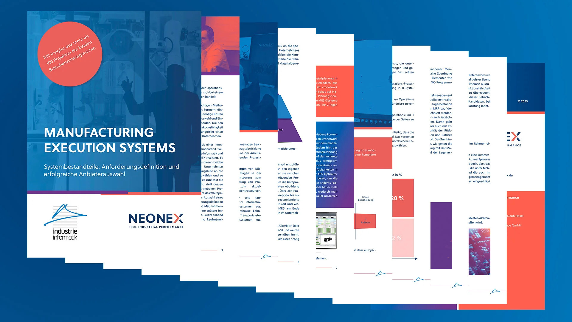 Gemeinsam mit dem MES-Anbieter Industrie Informatik haben wir bei NEONEX unsere Erfahrungen in einem praxisnahen Leitfaden gebündelt. Es bietet produzierenden Unternehmen einen strukturierten Ansatz zur Auswahl und Implementierung eines MES – von der Definition konkreter Anforderungen über Gap-Analysen und Maßnahmenplanung bis zur finalen Systementscheidung entlang funktionaler, organisatorischer und kaufmännischer Kriterien.