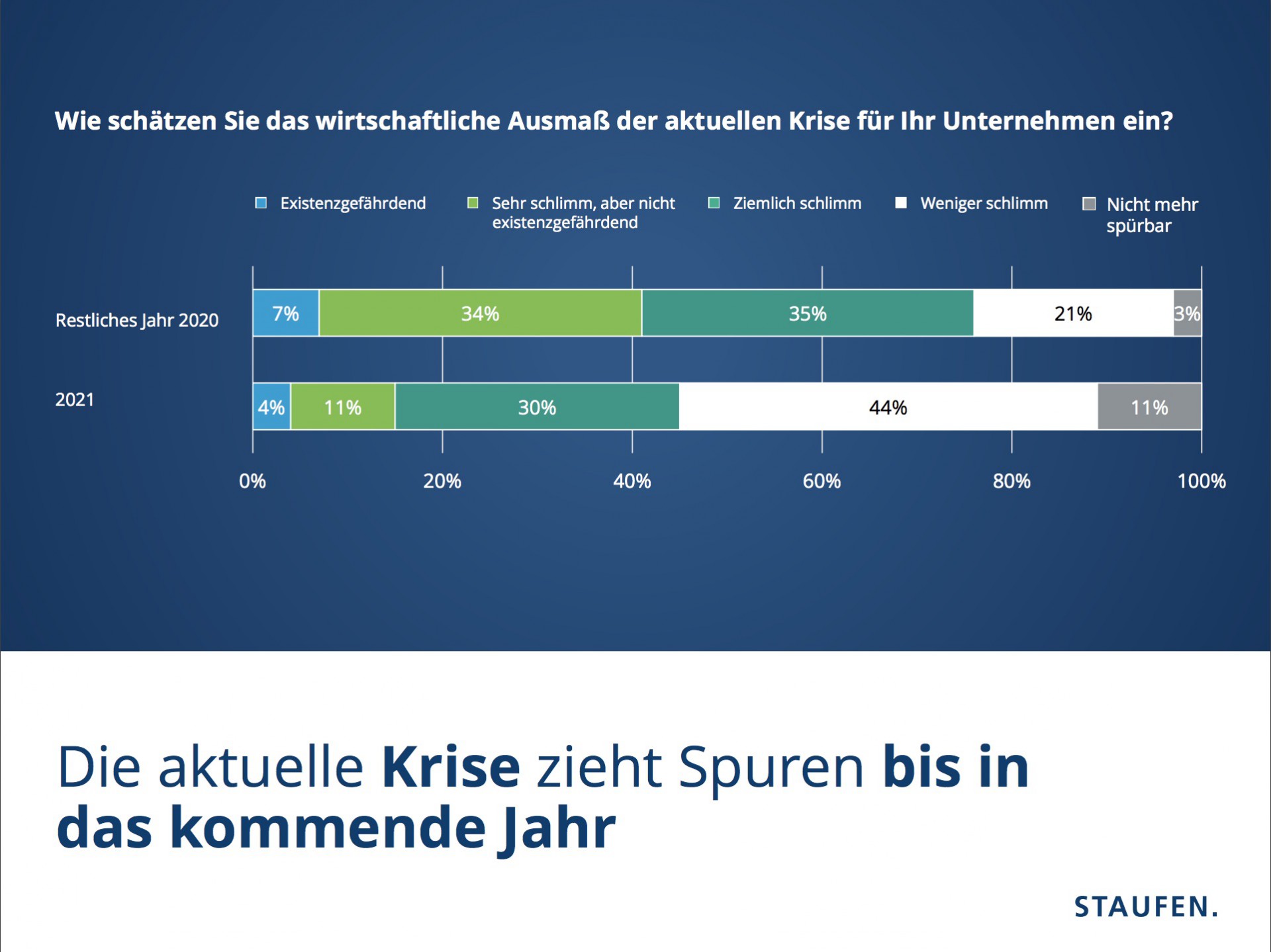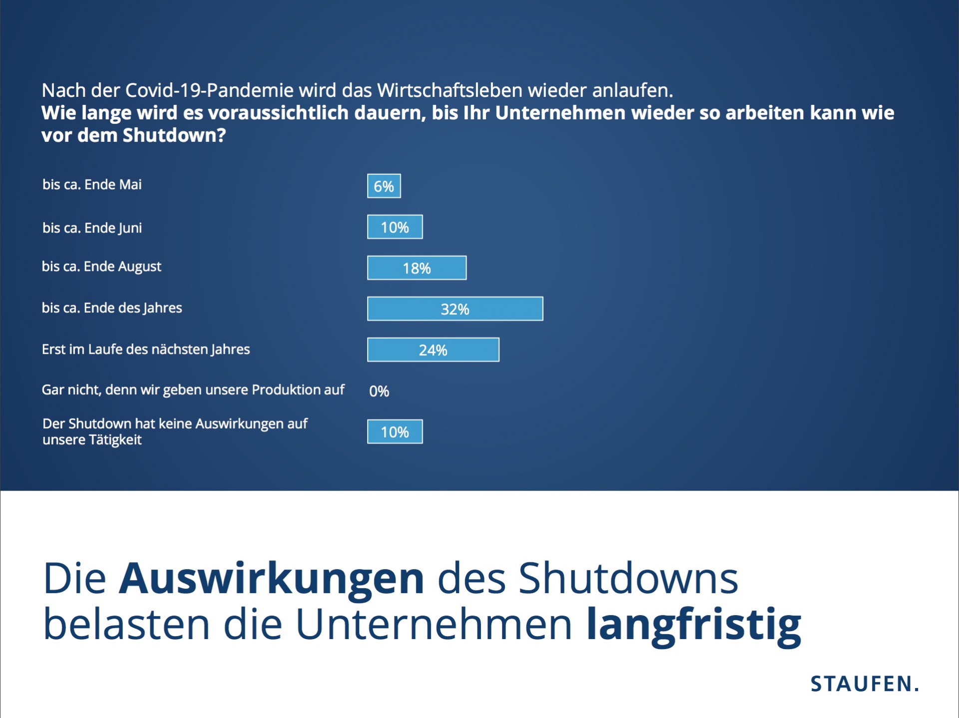 Köngen – Die weltweit eingeleiteten Maßnahmen zur Eindämmung der Covid-19-Pandemie entwickeln sich für die Industrie zu einer langanhaltenden Belastungsprobe. 56 Prozent der Unternehmen gehen davon aus, dass sie frühestens zum Jahreswechsel oder sogar erst im Laufe des kommenden Jahres wieder so arbeiten können wie vor dem Shutdown. Laut der aktuellen Studie „Neustart nach dem Shutdown 2020“ befürchten sieben Prozent der Firmen allerdings, bis dahin nicht mehr durchzuhalten. Für die Untersuchung hat die Unternehmensberatung Staufen im April mehr als 730 Unternehmen befragt. Die Teilnehmer kamen aus Deutschland, USA, China, Brasilien, Mexiko, Schweiz, Italien, Polen, Ungarn, Tschechien, Slowakei und Rumänien.