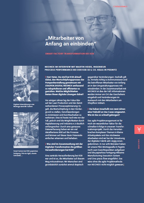 Eine zentrale Herausforderung bei KSB war und ist es, die Mitarbeiter auf diesem Weg mitzunehmen. Wir Menschen sind grundsätzlich zunächst einmal skeptisch gegenüber Veränderungen. Deshalb gilt es, Vorteile richtig zu kommunizieren und die betroffenen Mitarbeiter von Anfang an in den Umgestaltungsprozess mit einzubinden. In der Zusammenarbeit mit NEONEX ist dies der Fall: Informationen werden immer am Ort des Geschehens eingeholt und Veränderungen im Austausch mit den Mitarbeitern am Shopfloor initiiert.